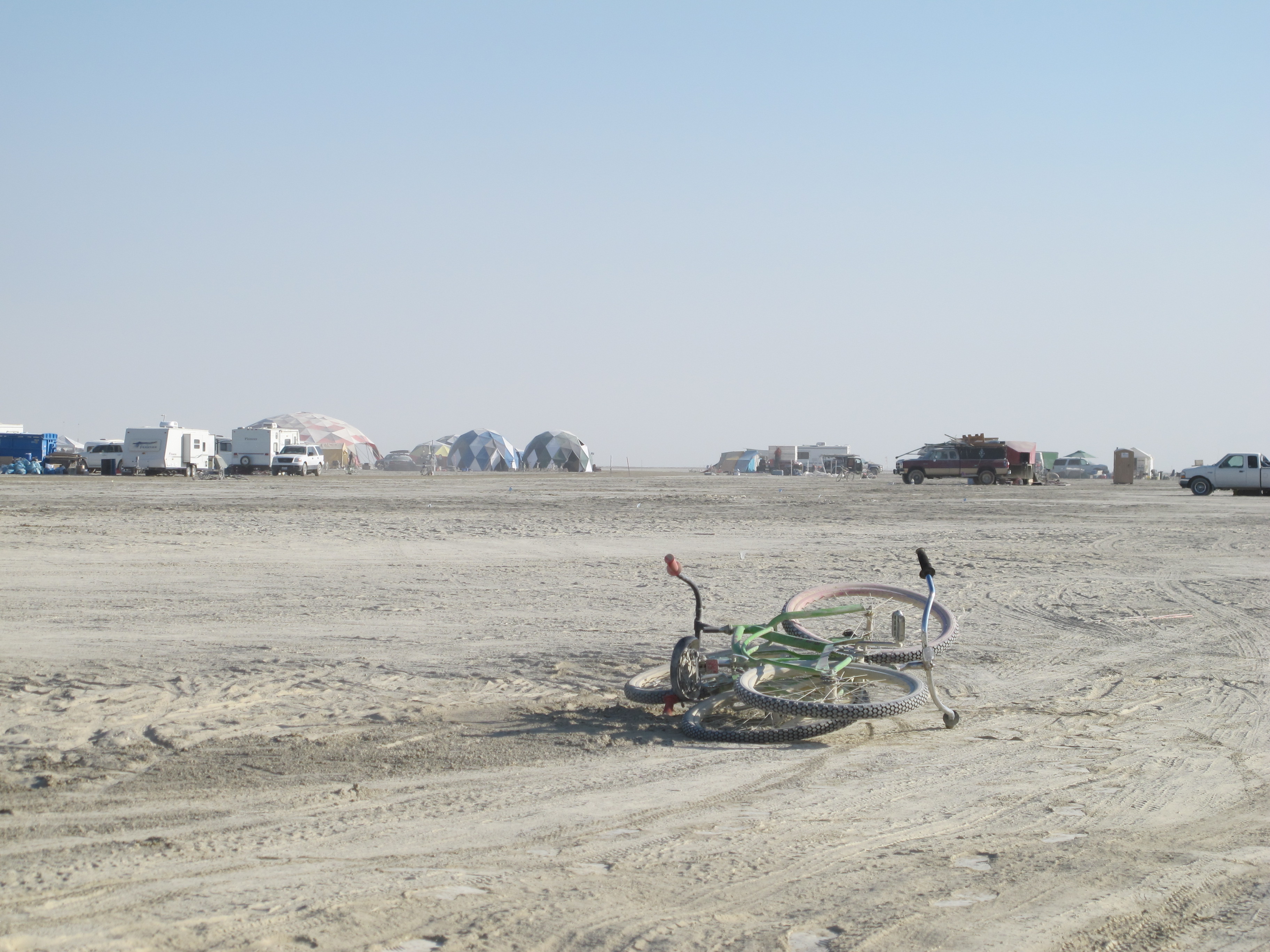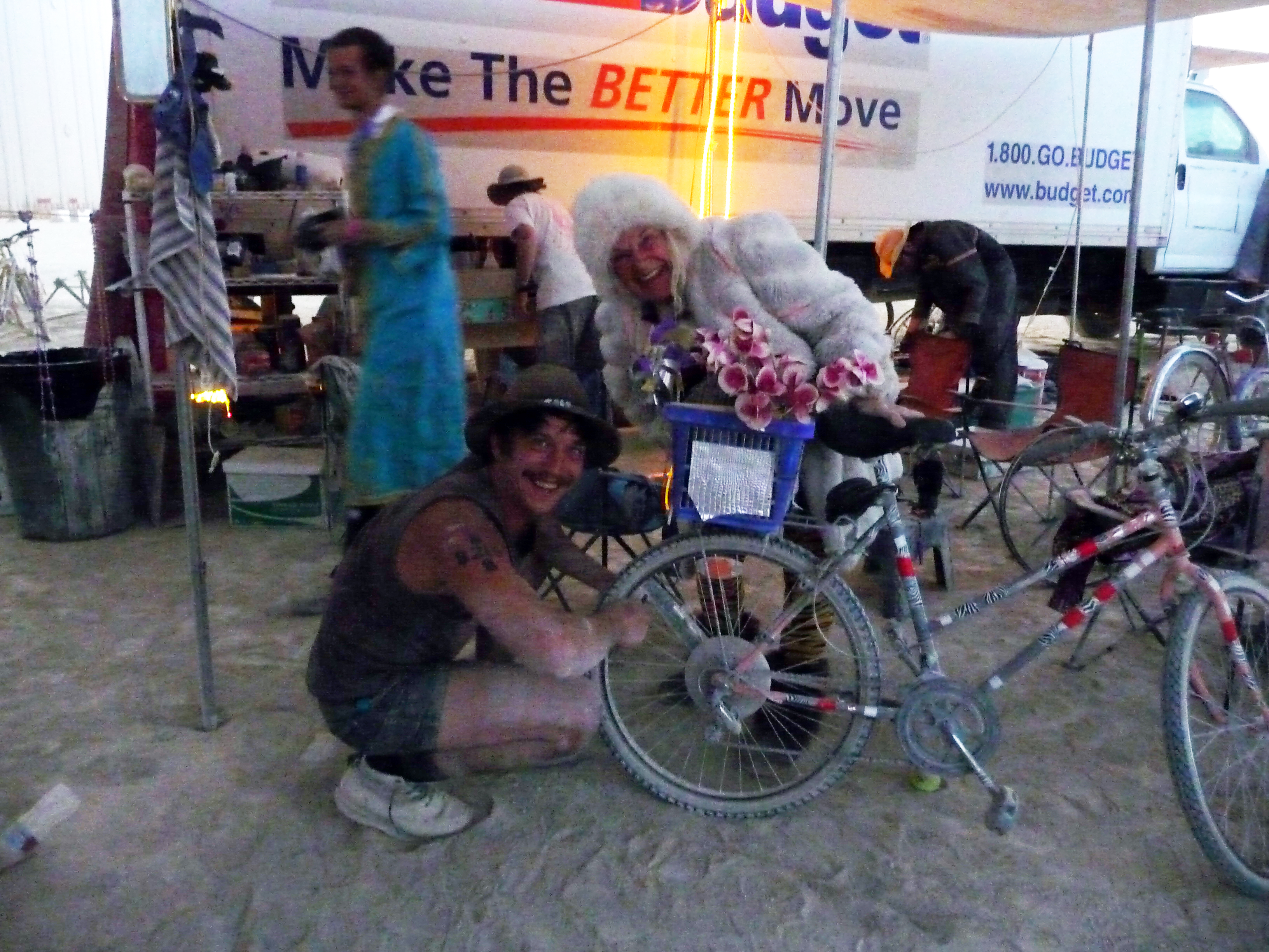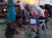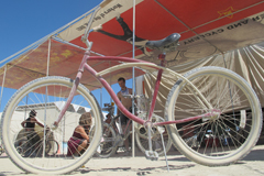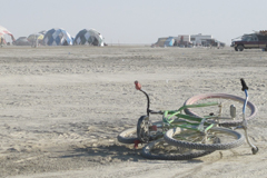 Yellow Bikes in Black Rock CityThe first thing you need to know about Yellow Bikes at Burning Man is that they're green. Yes green. The Yellow Bike tradition was started ages ago before Burning Man was even hanging out on the beaches of San Francisco. Generically, a Yellow Bike is a bicycle that has been given to the public. The bikes are ususally painted yellow as a way to distinguish them as part of the program. Yellow Bike programs are generally meant to facilitate sustainability efforts in cities by providing convenient free transportation to the masses. Burning Man's Yellow Bike program has been around for years. Hundreds of beach cruiser style rides are painted green and spread out all over the Playa. Anyone can grab an unoccupied Yellow Bike and take it to their destination of choice where a rider should leave the bike in an obvious place for the next pedestrian that fancies a wheeled stroll. The only other rule for the Yellow Bikes of Black Rock City is that you wear pants. No naked riding a Yellow Bike. Overall it is a great system and getting better all the time. Unfortunately, while Yellow Bike programs subscribe to high ideals, the rest of the public usually falls somewhere below this. A good Yellow Bike program takes tons of resources to start, maintain, and promote effectively. Yellow Bikes are often commandeered by citizens and removed from public access over time. Most Yellow Bikes are created from inexpensive bicycles and quickly fall into disrepair. With no tracking system, the bikes cannot be easily retrieved, repaired, and returned to the road. At Burning Man the Yellow Bike program has been far more successful than any others that I've encountered. It is my understanding that the Yellow Bike program has a large anonymous donor (rumored to be several different famous people) that can add more bikes every year, fund a team of people to find and repair the bikes throughout the week, and promote it effectively. The bikes start out the week in great shape. There are hundreds of them (someone told me there were 700 in 2011) and they seem to be everywhere. People pick them up at the bathrooms and drop them off at the Temple. Find one at Center Camp and leave it at the Man. The bikes are easy to find and reliable. It's no solution to bringing your own bike, but a well placed Yellow Bike is the perfect relief when you're hoofing it and really want to get somewhere in a hurry. But the Yellow Bikes at Burning Man (which are painted green, don't forget) start out life as department store cheapies and are not designed with the punishing Playa in mind. By the end of the week, it is almost impossible to find a working Yellow Bike at Burning Man. As Black Rock City's population has increased, the Yellow Bikes have suffered. Furthermore, Burners are increasingly taking advantage of the system. More and more Yellow Bikes are pulled out of the public system in the first days of the week. They can be easily disguised with spray paint, tape, or a variety of standard Burning Man decorations. Add a bicycle lock and you just got yourself cheap transportation for the week that you didn't have to cart out to the desert and you don't have to worry about humping out again. (Not cool.) At least one bicycle camp used last year's Yellow Bikes for spare parts and left a pile of useless frames behind when they headed out. This is super not cool since the Yellow Bikes get fixed up and returned to the Playa every year (sustainability!). There is a logic to using a broken bicycle to repair a fixable bicycle. One working bike is better than two dead ones, right? Not exactly. Public Works does a pretty good job of picking up the carcasses throughout the week and some of these get fixed up and put back on the dust. But take a stroll on Monday morning after the Temple burn and you'll see a dusty landscape littered with dead Yellow Bikes. Hammer And Cyclery and Re-Cycle, Inc share no official affiliations with Burning Man, Black Rock City, LLC. |